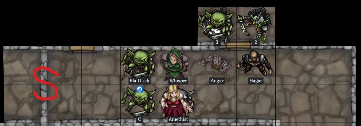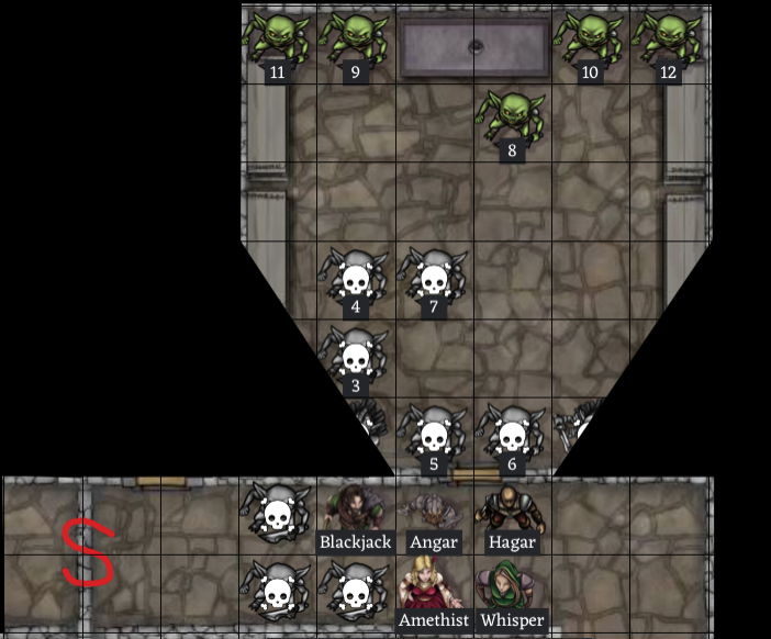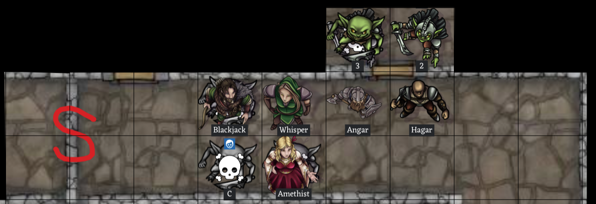 Round 8: ✨ Angar swings his battle axe at Goblin 4, welcoming him to the fight with quite the solid hit ✨ Hagar's attacks do not harm Goblin 2 🎈Whisper's next arrow flies true, killing Goblin 4 before he has a chance to even fight! 🎈 ✨Amethist slings a rock at Goblin 2, rattling him ✨ 💥Goblin 2 gets a swipe of his sword through Hagar's defenses, wounding him for 1 hp damage 💥 🎈Blackjack sees an opening in the fighting and shoots an arrow into Goblin 2, killing him! 🎈 Two more goblins step into the doorway, and their companions behind them pull the corpses of Goblins 2 & 4 out of the way.