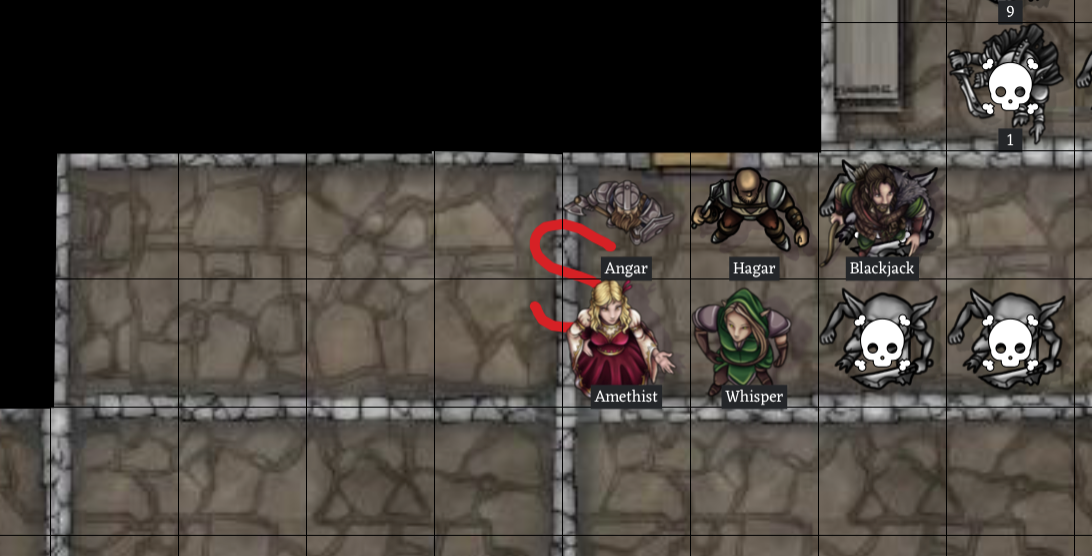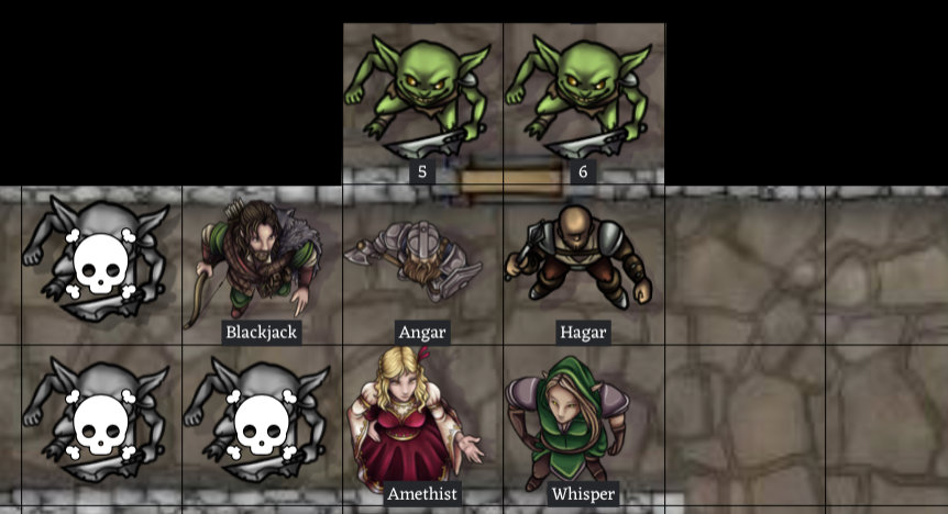 Amethist is able to advance 5 feet toward Goblin C to attack. Goblin D jumps on top of the body of his fallen comrade to attack Whisper. Round 6: 🎈Amethist and Goblin C trade attacks. Goblin C is unable to harm her, and Amethist's mighty swing of her war hammer smashes him to the floor, killing him. 🎈 Goblin 2 attacks Hagar furiously, and Hagar is only barely able to fend off his attacks. Goblin 3 is able to finally recover his weapon, but does not have a chance to attack this round. Angar switches to attack Goblin 2 with his battle axe, but is unable to hurt him. 🎈Whisper and Goblin D trade attacks. Goblin D's swing of his sword goes wide and Whisper takes advantage of the bad swing to stab it through the heart, killing him! 🎈 Hagar's attacks against Goblin 2 also fail to land any hits with damage. (edited)