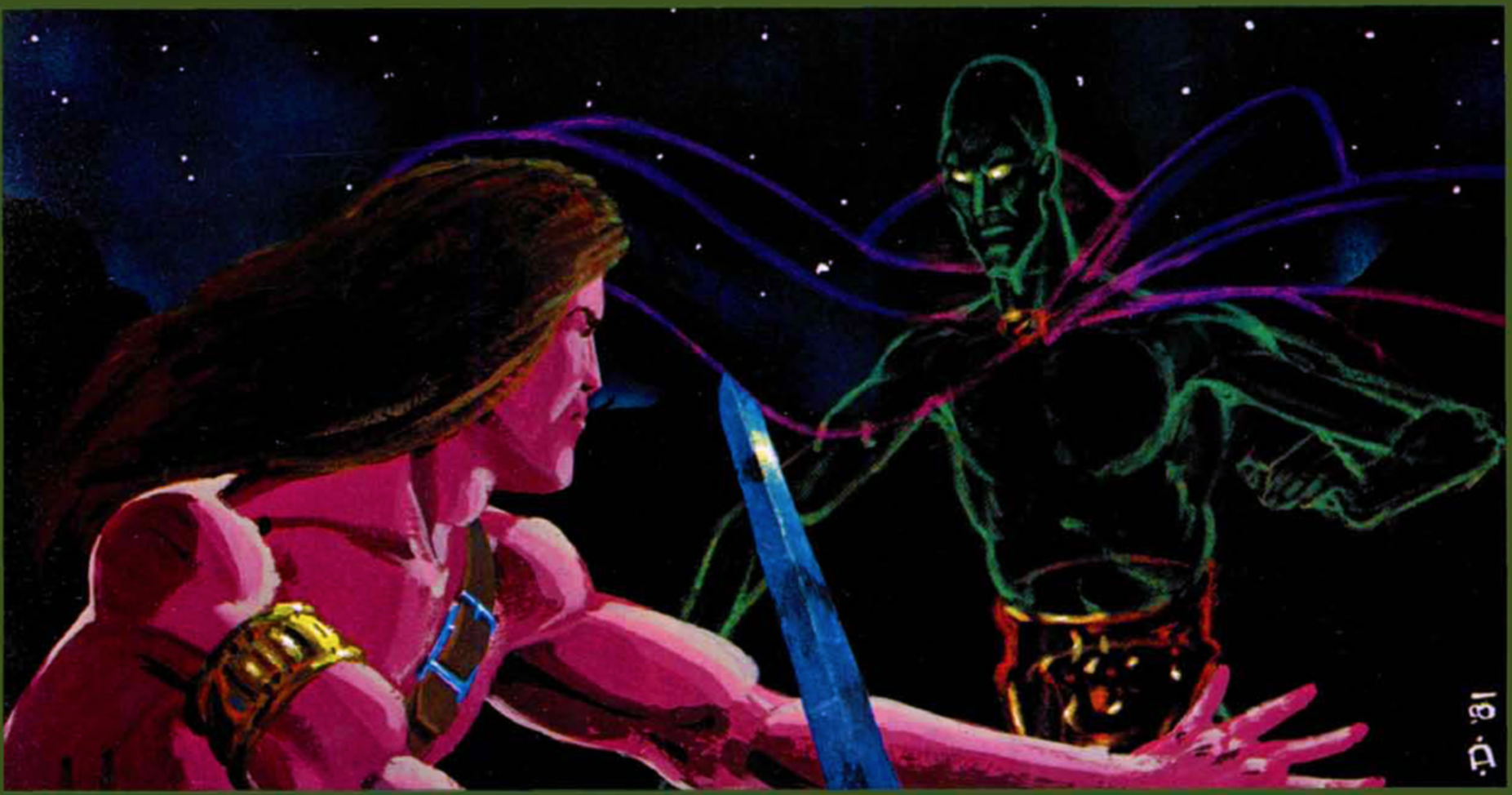 As you stand around discussing what to do next, the room starts to glow a green light, and you see 6 translucent green beings fade into view, surrounding you. They wear long flowing robes that appear to move in a breeze even though there is no air movement at all in this room. Three are bald men, and three are women with long flowing hair. Their bodies are slender, giving them the appearance of being much taller than they are, and they float 6 to 10 inches above the ground. They do not speak. One of the women floats forward a bit, drawing your eyes toward her.