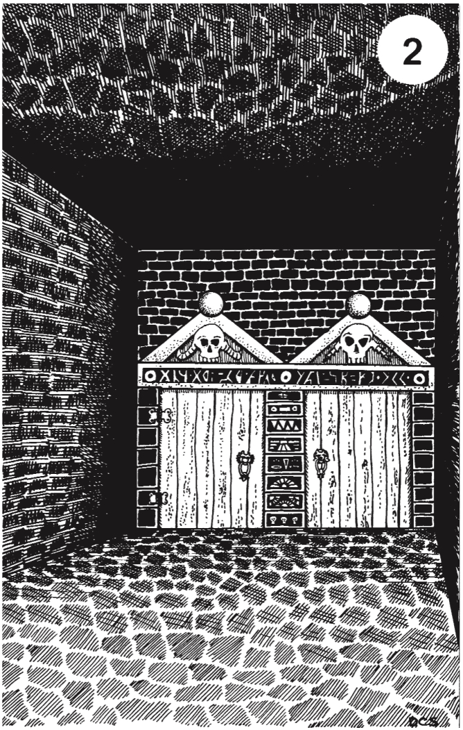The corridor is of plain stone, roughly worked, and it is dark and full of cobwebs. The ceiling is only 10' high. The daylight from behind you enables you to dimly see what appear to be two separate doors at the end of the corridor.