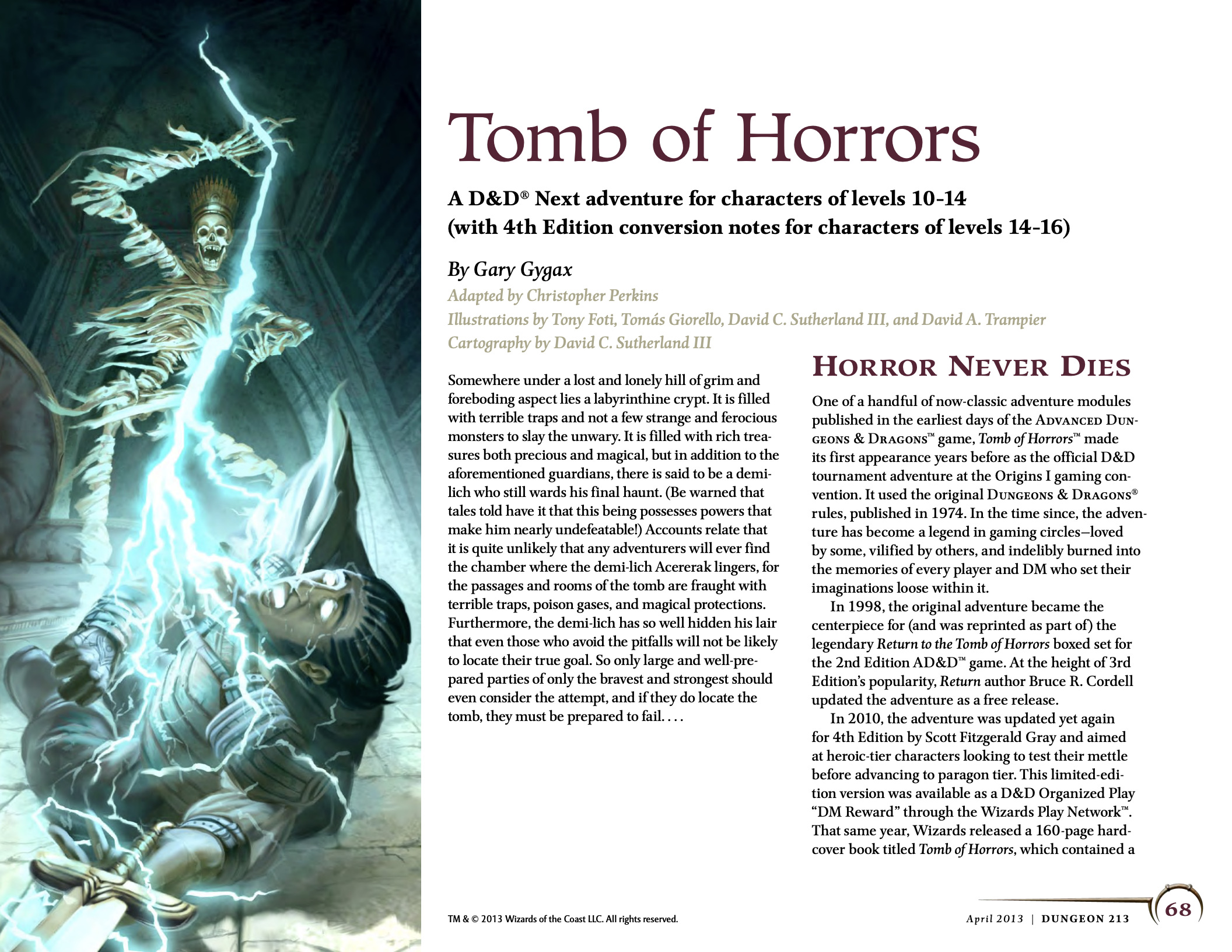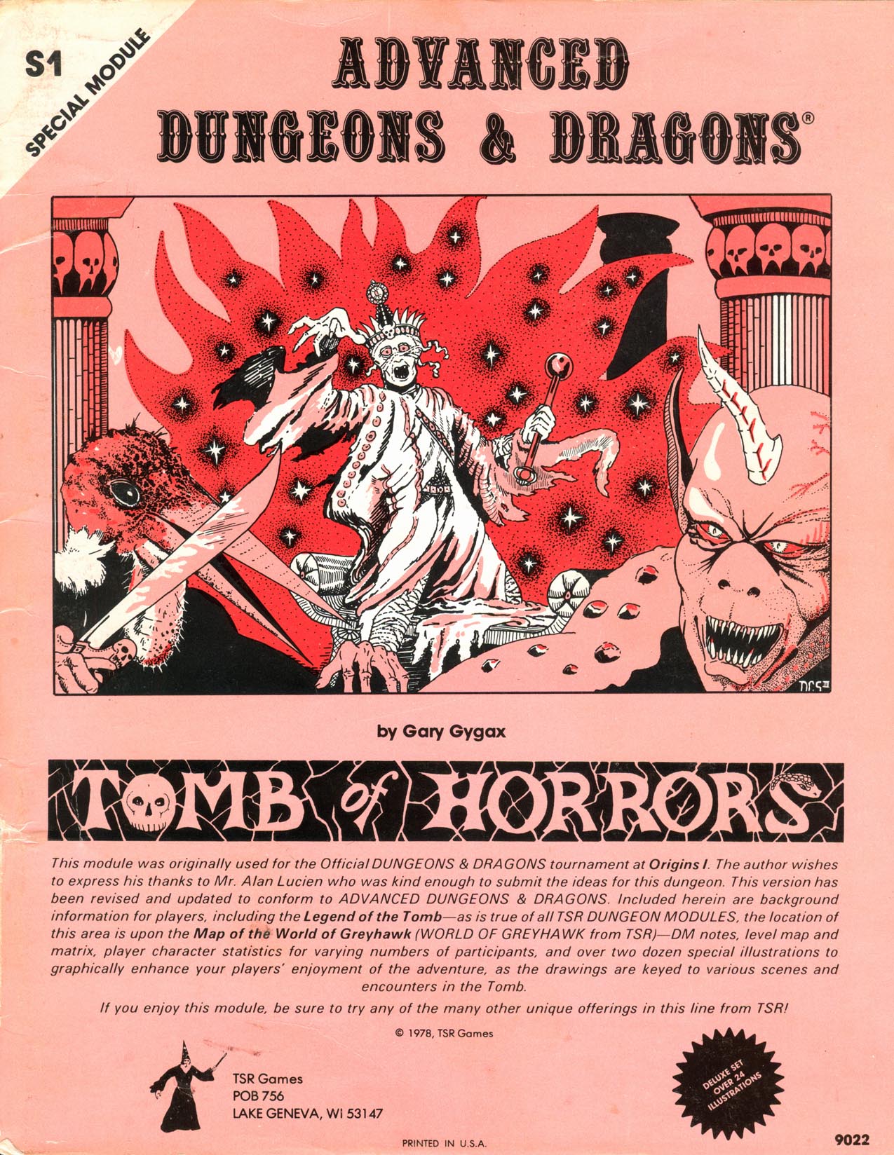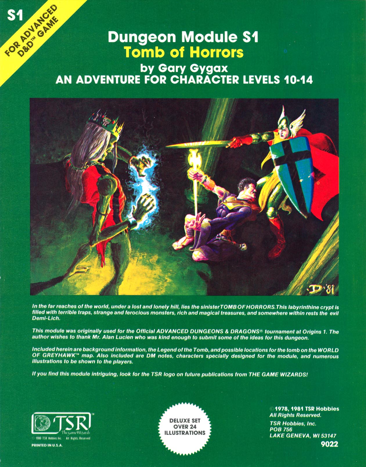 Somewhere under a lost and lonely hill of grim and foreboding aspect lies a labyrinthine crypt. If is filled with terrible traps and not a few strange and ferocious monsters to slay the unwary. It is filled with rich treasures both precious and magical, but in addition to the aforementioned guardians, there is said to be a demi-lich who still wards his final haunt. (Be warned that tales told have it that this being possesses powers which make him nearly undefeatable!) Accounts relate that it is quite unlikely that any adventurers will ever find the chamber where the demi-lich Acererak lingers, for the passages and rooms of the Tomb are fraught with terrible traps, poison gases, and magical protections. Furthermore, the demi-lich has so well hidden his lair, that even those who avoid the pitfalls will not b e likely to locate their true goal. So only large and well-prepared parties of the bravest and strongest should even consider the attempt, and if they do locate the Tomb, they must be prepared to fail. Any expedition must be composed of characters of high level and varied class. They must have magical protections and weapons, and equip themselves with every sort of device possible to insure their survival.
