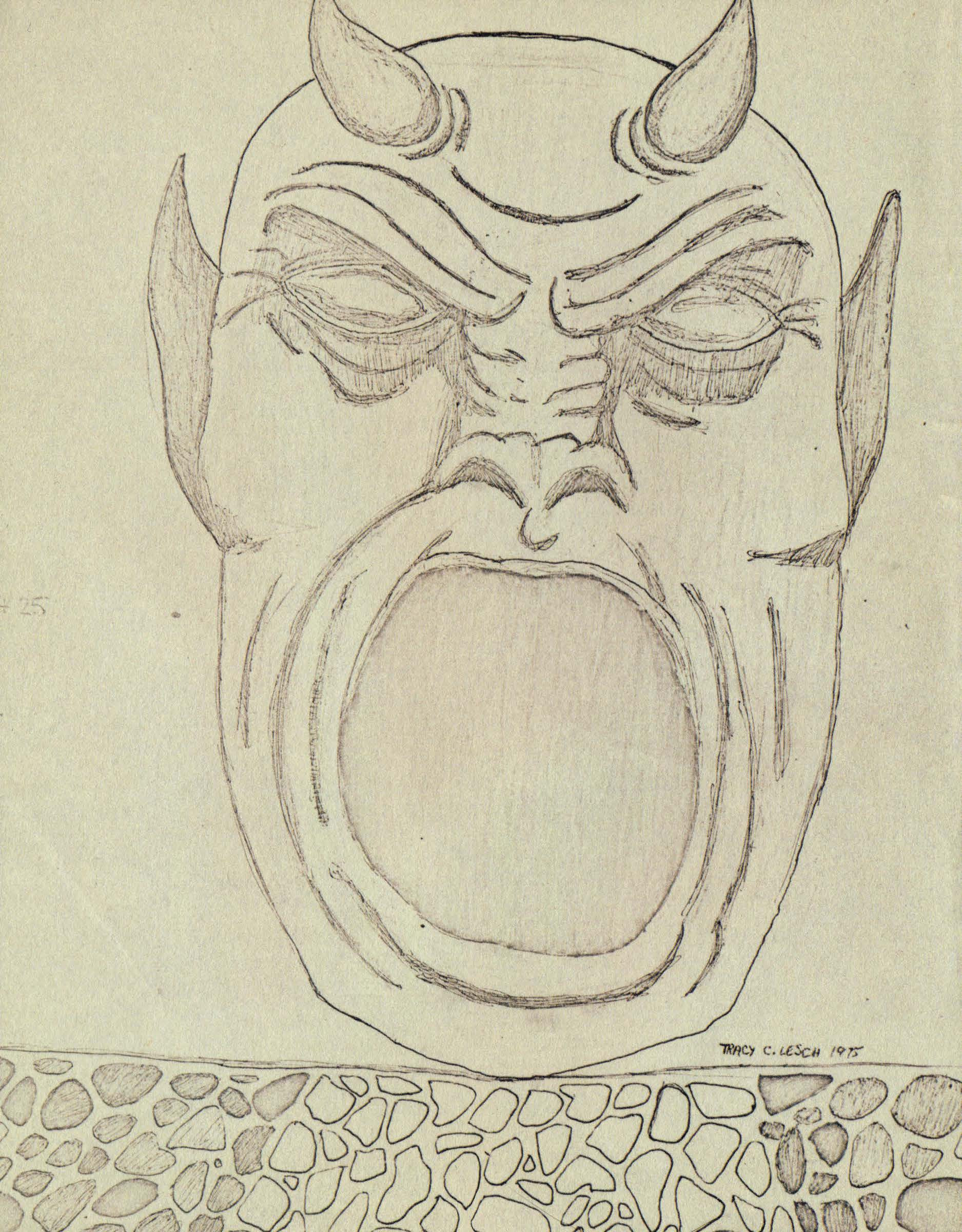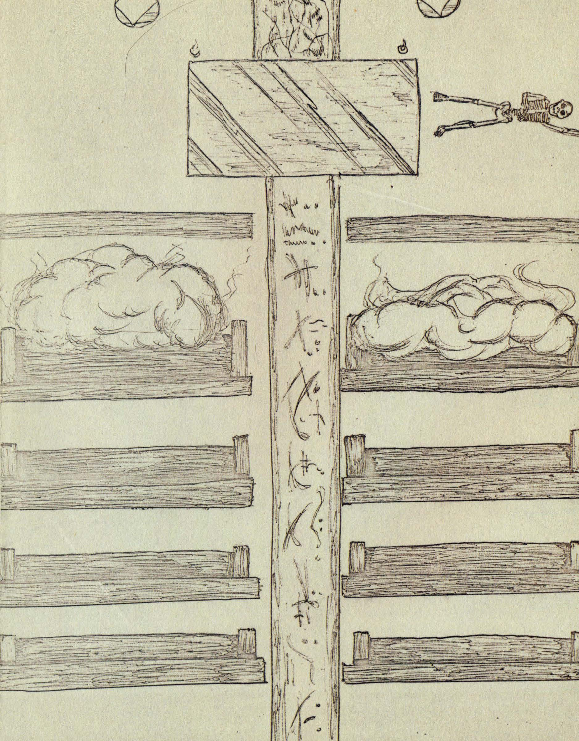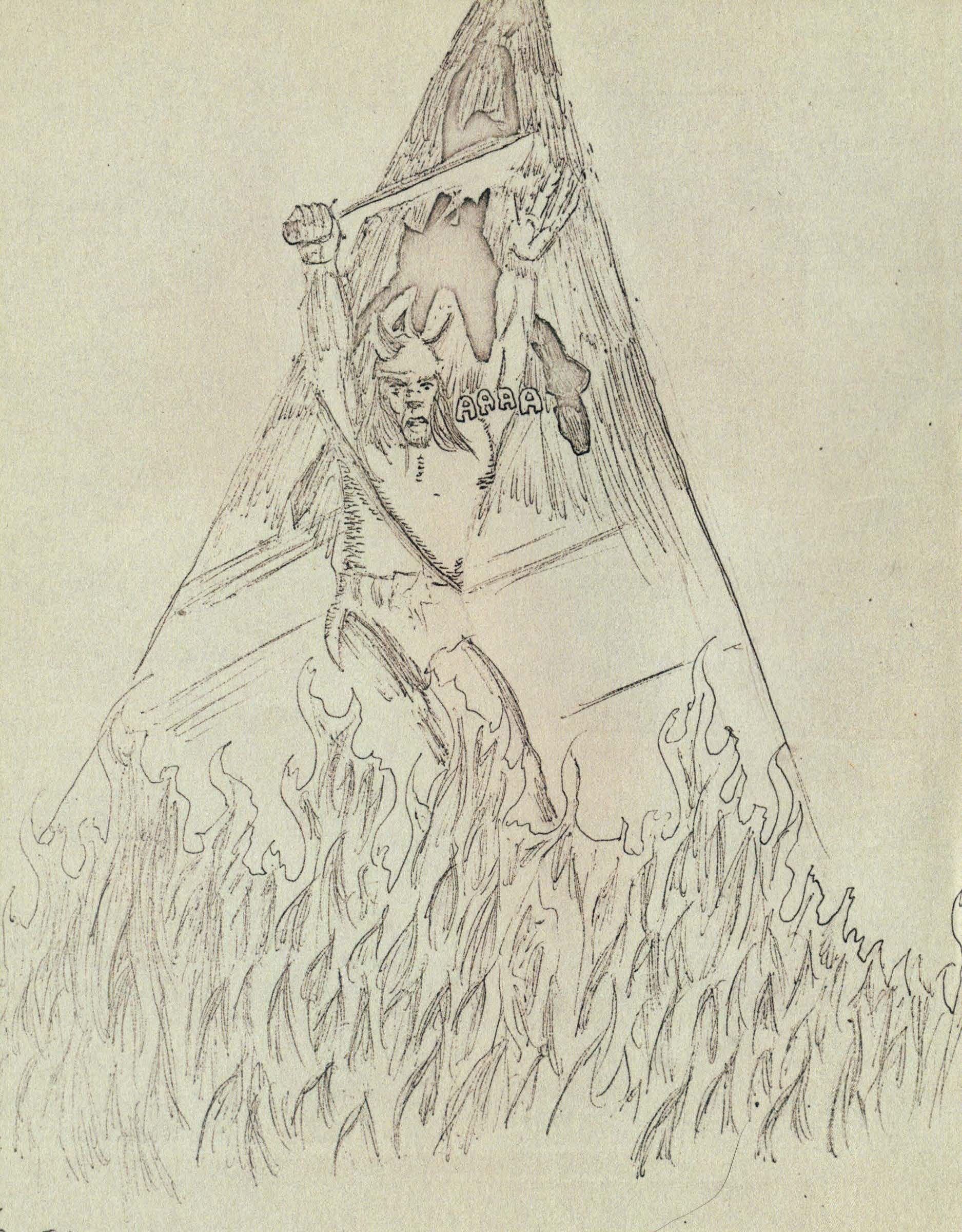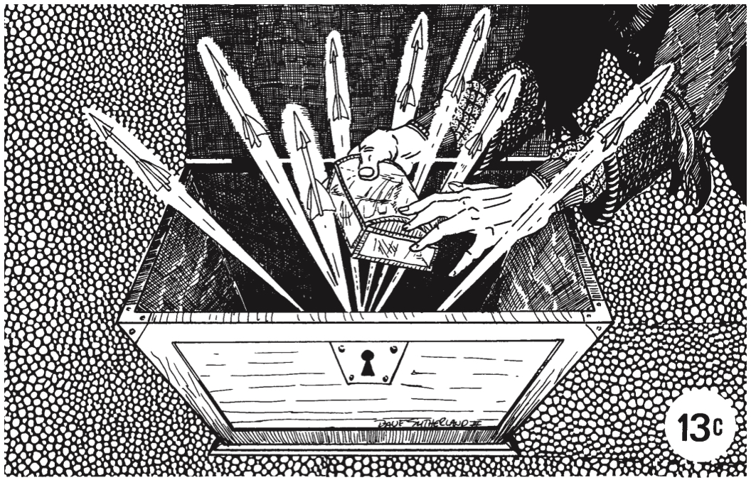 They will see what is obviously some form of temple area. There are scenes of normal life painted on the walls, but the people have rotting flesh, skeletal hands, worms eating them, etc. Yet there are also depicted various religious symbols of good alignment. What a puzzle! Could the demi-lich actually have been of good alignment? There is a mosaic path leading to the altar, and to either side great wooden pews face the worship area. A wooden railing divides the room, and south of it is the altar, a tiered dais with a wooden chair (nicely carved and padded), 2 large brass candelabra holding 5 white candles each, and in each corner a large white pottery urn stoppered with a brass and wood plug. A human skeleton in black chain mail (badly rusted and torn) points to an archway, similar to the others previously encountered. However, the mist in this archway is filled with luminous orange vapors of an exciting hue.