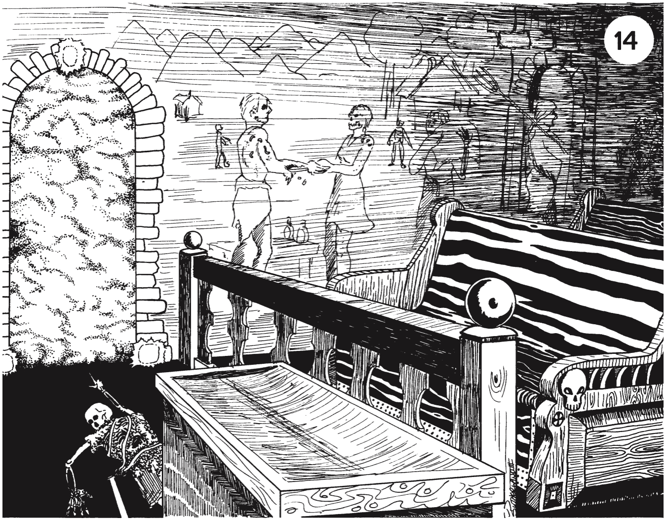 Old Man from Scene 24 then cast Dispel Magic on the archway, which continued to glow and the mists remained. The party then walked through the archway, finding a small room beyond. Searching for secret doors, no one was able to find them or anything else beyond the archway.