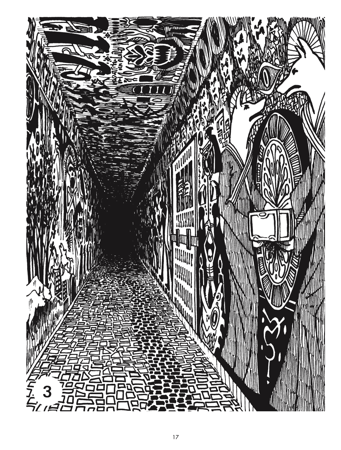 They cleared enough rock to crawl in. They saw a hallway with a stone floor, with some stones a dark red creating a winding pathway. The walls and ceiling are covered with plaster with frescoes painted on them.